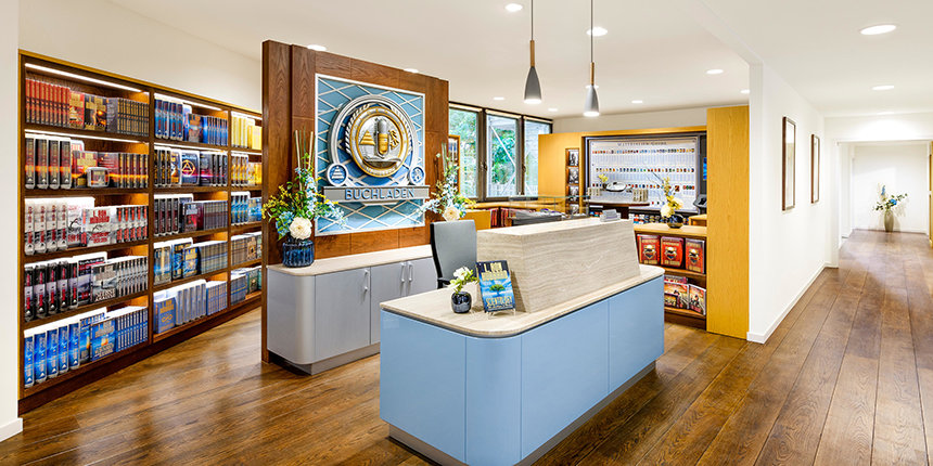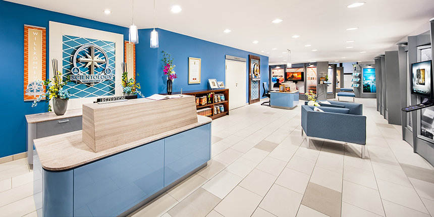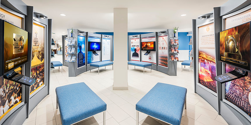 Mientras los visitantes entran en la nueva Iglesia de Scientology de Stuttgart son sorprendidos por una gama de azul acero, cromo y grises que reflejan la identidad de alta tecnología de la ciudad. Los pálidos reflejos de la instalación mezclados con madera de caoba se combinan para dar un aspecto de calma y de bienvenida al Centro de Información para el Público donde se presenta una introducción a Dianetics y Scientology. Sus exhibidores presentan más de 500 películas en 17 idiomas que comparten las creencias y prácticas de la religión de Scientology, y la vida y el legado del Fundador de Scientology, L. Ronald Hubbard.