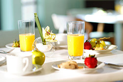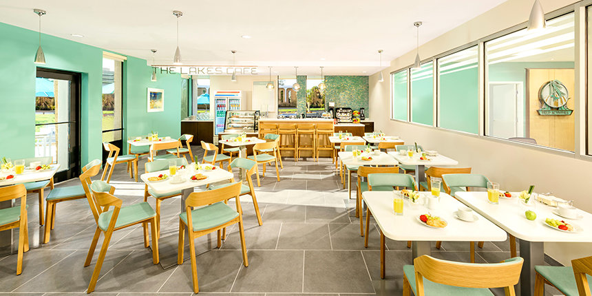 El elegante Café Lakes, cuenta con asientos tanto en interiores como al aire libre, ofreciendo un lugar de reunión para quienes asisten a eventos, así como para los feligreses durante los descansos en sus servicios de Scientology.