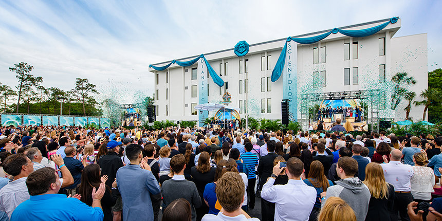 Mientras a solo unos minutos de la avenida de parques temáticos de Orlando, International Drive, verás a la nueva “estrella brillante”, ya centellando en la creciente galaxia interestelar de la Iglesia. La amplia instalación se encuentra en casi sienta en casi dos hectáreas en el centro de la ciudad más grande de Florida, a lo largo de las orillas del Lago Ellenor. En este lugar encantado, donde la risa y la imaginación son atemporales, una multitud de más de 2 000 Scientologists y sus amigos se reunieron bajo el mediodía del Centro de Florida, el sábado 12 de mayo, para celebrar la gran inauguración de la nueva Iglesia de Scientology.