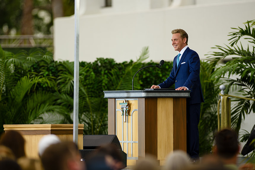 Acompañado de los Scientologists que encabezaron los esfuerzos para llevar a la vida esta nueva Iglesia, el Sr. David Miscavige inaugura la Iglesia de Scientology de Orlando.