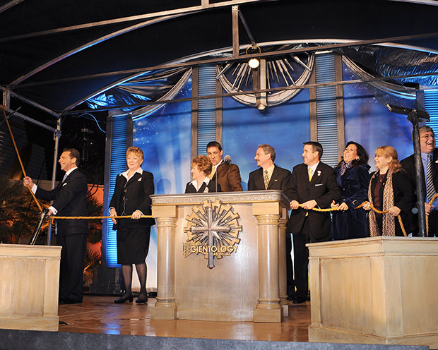 Acompañado por scientologists de la localidad que encabezaron el impulso de la construcción de la nueva Iglesia, El Sr. Miscavige cortó el listón e invitó a todos a entrar.