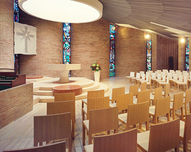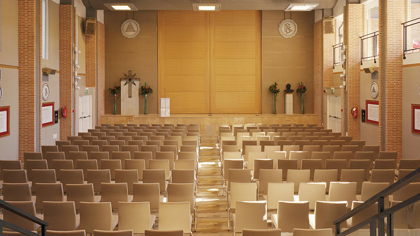 En el centro del edificio se encuentra un auditorio con 300 localidades para los eventos comunitarios y de la Iglesia.