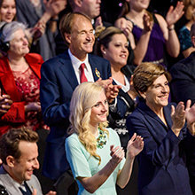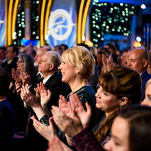 Luego llegó el momento de anunciar a los campeones del Juego de Cumpleaños de LRH. El escenario se transformó en un círculo de ganadores rodeado de rosas, con brillantes luces, sedas y trofeos relucientes. El Juego de Cumpleaños sigue la tradición de honrar al Sr. Hubbard con el regalo de la expansión en cada Iglesia de Scientology.